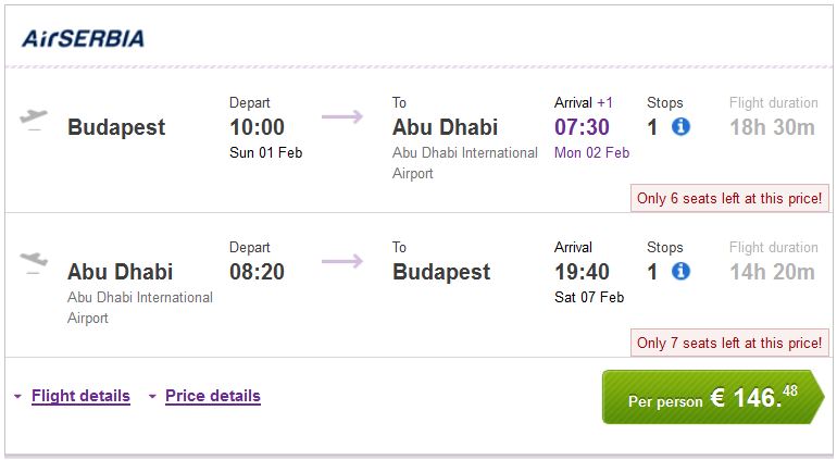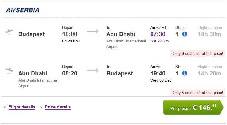 Air Serbia, bivši JAT, nudi odlične cijene povratnih avio karata za Ujedinjene Arapske Emirate. Putujte iz Budimpešte u Abu Dhabi po cijeni već od 146€ za povratnu avio kartu.