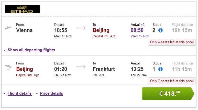 Polazak je moguć iz Beograda ili iz Beča, destinacije su Peking ili Šangaj, a cijene karti su gotovo pa jednake. Povratak mora biti u Njemačku, cijena je ista bio to Frankfurt, Minhen ili Düsseldorf.