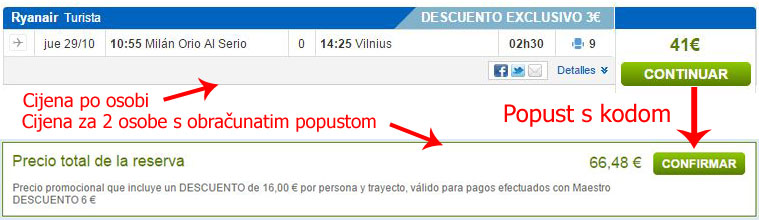 Čini li vam se ovo putovanje zanimljivim? Dostupno je već za 150€ ukupno za dvije osobe ili samo 75€ po osobi ukoliko karte kupujete s Maestro karticom na rumbo.es stranicama i iskoristite kod za popust na način opisan ovdje. Važno je pretragu napraviti za dvije osobe kako bi mogli iskoristiti kod za popust, putujete li sami kod nećete moći iskoristiti u ovakvoj kombinaciji. Ukoliko putujete sami ili imate problema sa višestrukom upotrebom koda za popust karte možete kupiti na rumbo.es stranicama bez korištenja Cuponation linka za samo malo više cijene ili direktno na Ryanair stranicama. Autobusne karte kupujete direktno na stranicama prijevoznika Lux Express.
