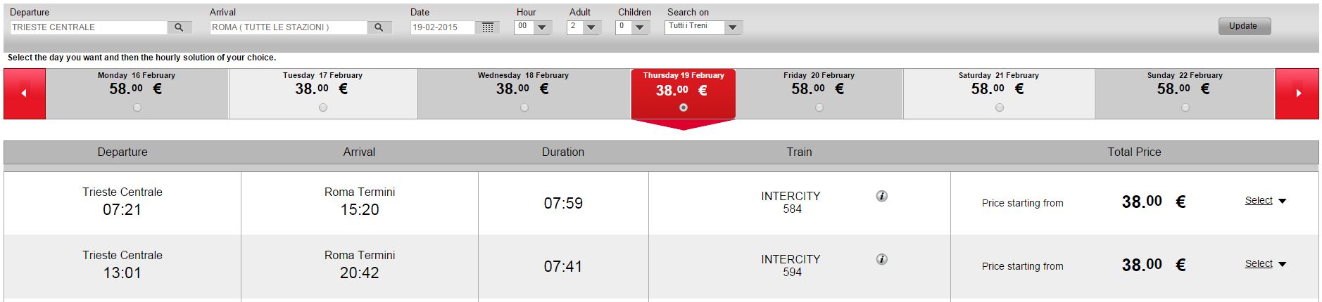 Trieste Centrale 07:21 – Roma Termini 15:20, cijena je 19€ po osobi, 38€ za dvije osobe