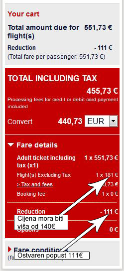 - Najniža cijena avio karte, bez svih taksi, ne smije biti manja od 140€