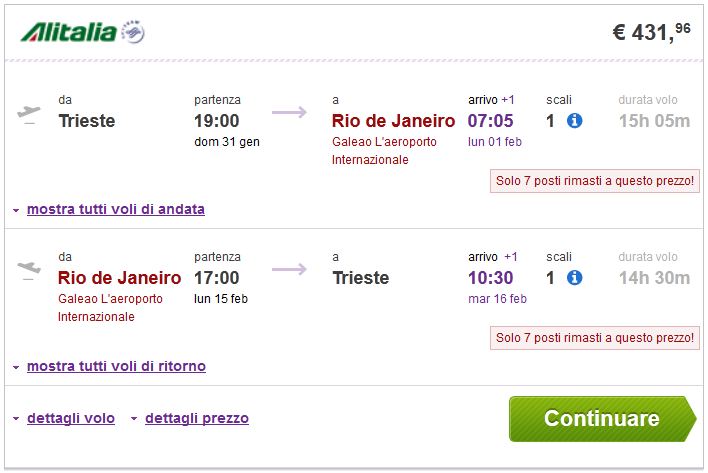 Alitalia trenutno nudi akcijske cijene za svoje letove iz Italije u Rio de Janeiro ili Sao Paulo. Akcijske cijene mogu se ostvariti u 1., 2. ili 3. mjesecu 2016. no ono što će većini biti najzanimljivije jesu letovi u vrijeme karnevala kada su redovne cijene uvijek znatno više. U trenutnoj akciji svoju povratnu avio kartu iz bliskog nam Trsta možete nabaviti već za 431€ u udarnim karnevalskim terminima.